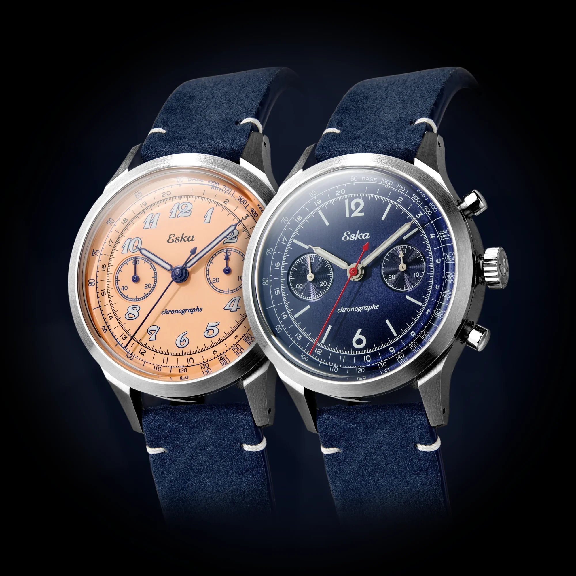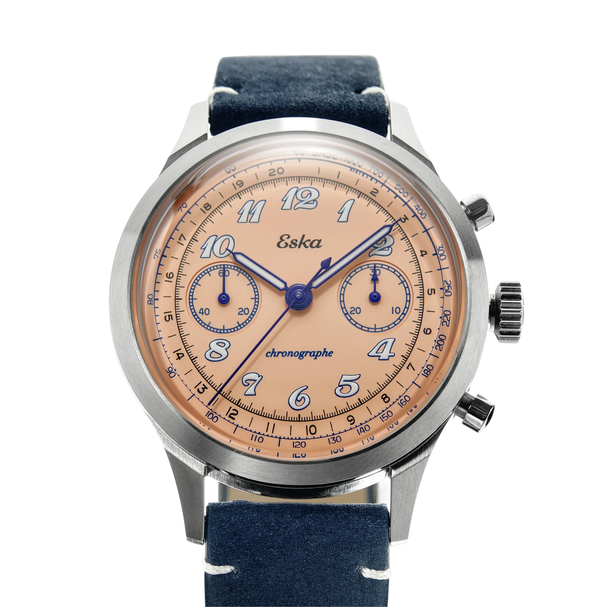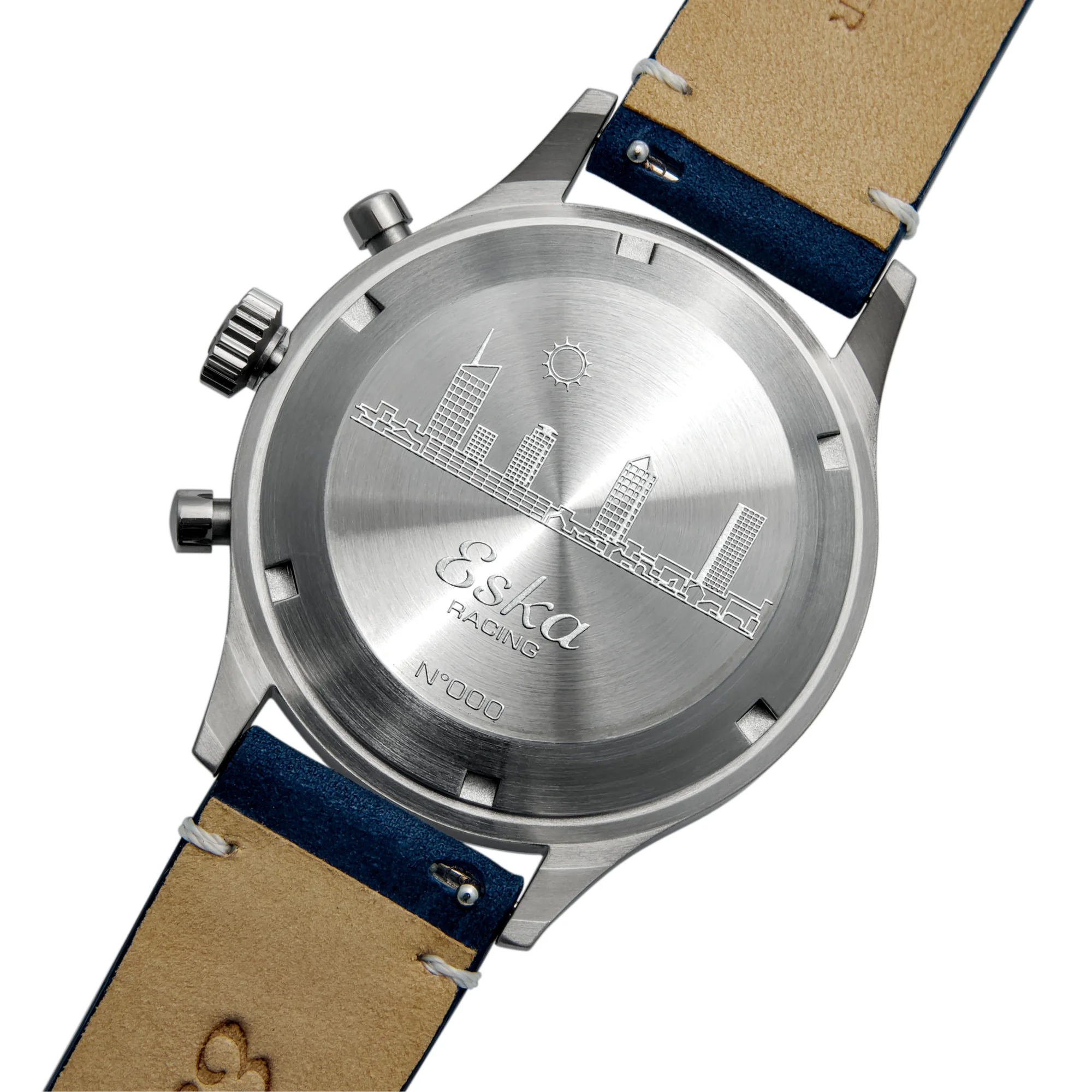 THE Eska Chronograph Racing Azur It stands out for its dynamic elegance. It sports a Vertical brushed azure dial Captivating, enhanced by white railway track markings that ensure excellent legibility. The bright red chronograph hand adds an instantly recognizable racing touch.