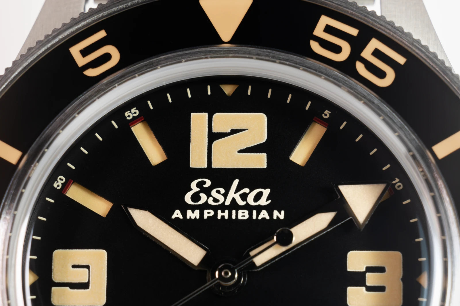 The lines of the Amphibian "250" Black Shark are distinguished at first glance by the profile of the 40mm case, by the unidirectional bezel with reverse and thanks to the sandwich dial with the so-called "oversized" cardinal points.