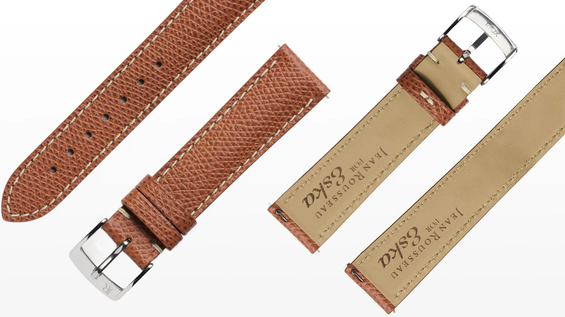 • Un bracelet en cuir de veau grainé marron, réalisé en collaboration avec Jean Rousseau, avec doublure siglée Eska, boucle ardillon et pompes rapides pour un changement facile sans outil.